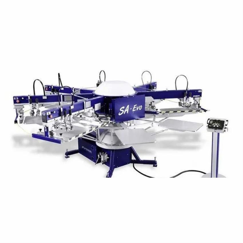 IIGM SA-Evo 8 automatic screen printing machine with 8 pallets. Max frame 58.8x80cm, image area 40x45cm. Production capacity: 900 pc/h.