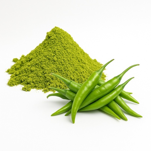 Finely ground, dehydrated green chili powder from India. Features a vibrant green color, ideal for adding spice and flavor to various culinary applications.