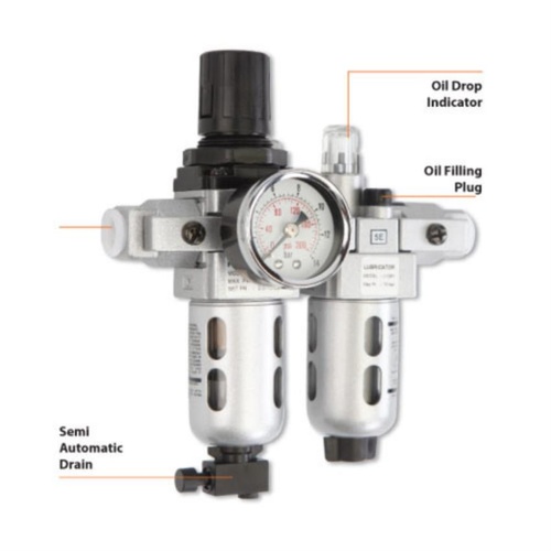 Industrial activated carbon filter regulator. Features 20 CFM maximum flow rate and 0.5-10 BAR pressure adjustment. Semi-automatic drain type for efficient industrial use. Made in India.