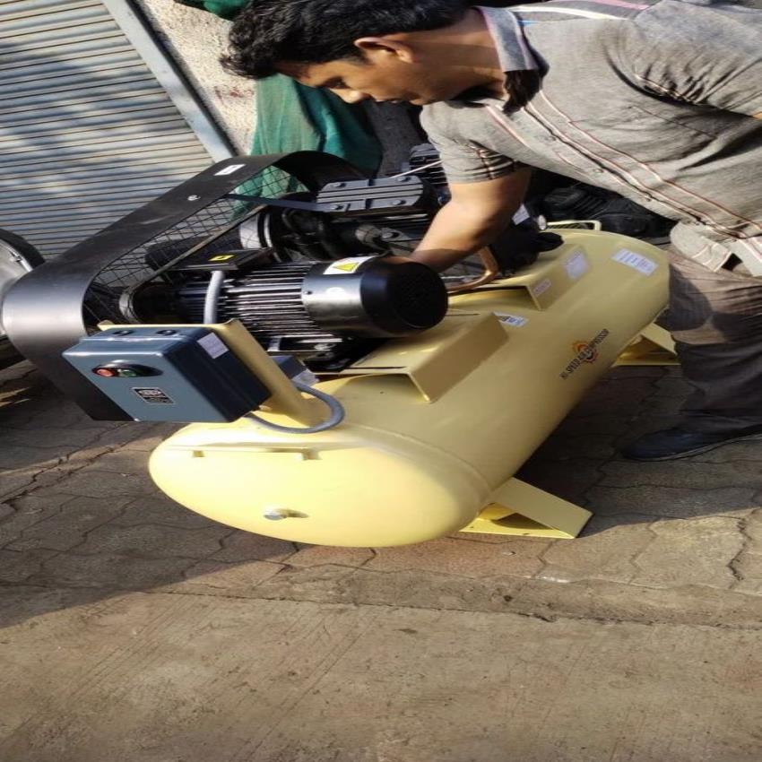 Reciprocating compressor with 5 HP motor and 8 Bar pressure. Air-cooled system delivers a maximum flow rate of 10 CFM for industrial use.
