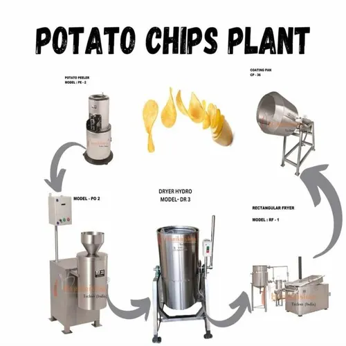 Fully automatic stainless steel potato chips plant for industrial use. Features 200 kg/hr capacity and robust construction. Made in India.