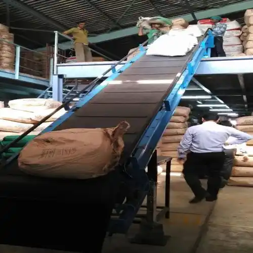 Industrial mild steel bag stacking conveyor. Designed for efficient material handling in industrial settings. Made in India.