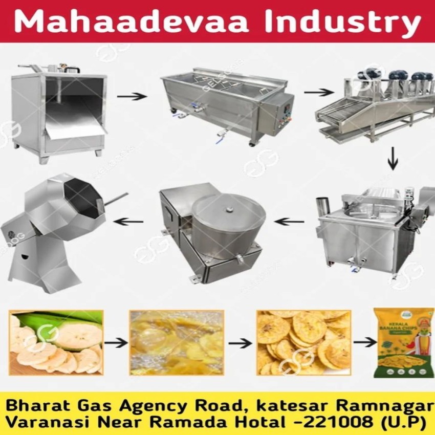 Automatic banana slicer machine for industrial use. 50 kg/hr capacity, 2 HP power consumption, and variable thickness settings. Made in India, weighing 500 Kg.