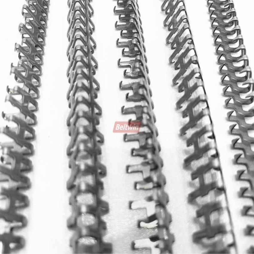 Metal mechanical belt fasteners in a chain shape for industrial applications. Features include various surface treatments. Packaged individually in boxes.