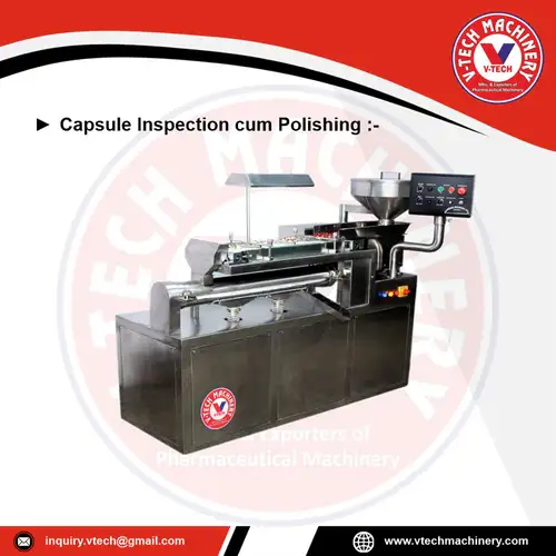 Semi-automatic SS 304 capsule inspection and polishing machine for industrial use. Capable of handling capsule size 5 with an approximate output of 40,000 capsules per hour. Made in India.