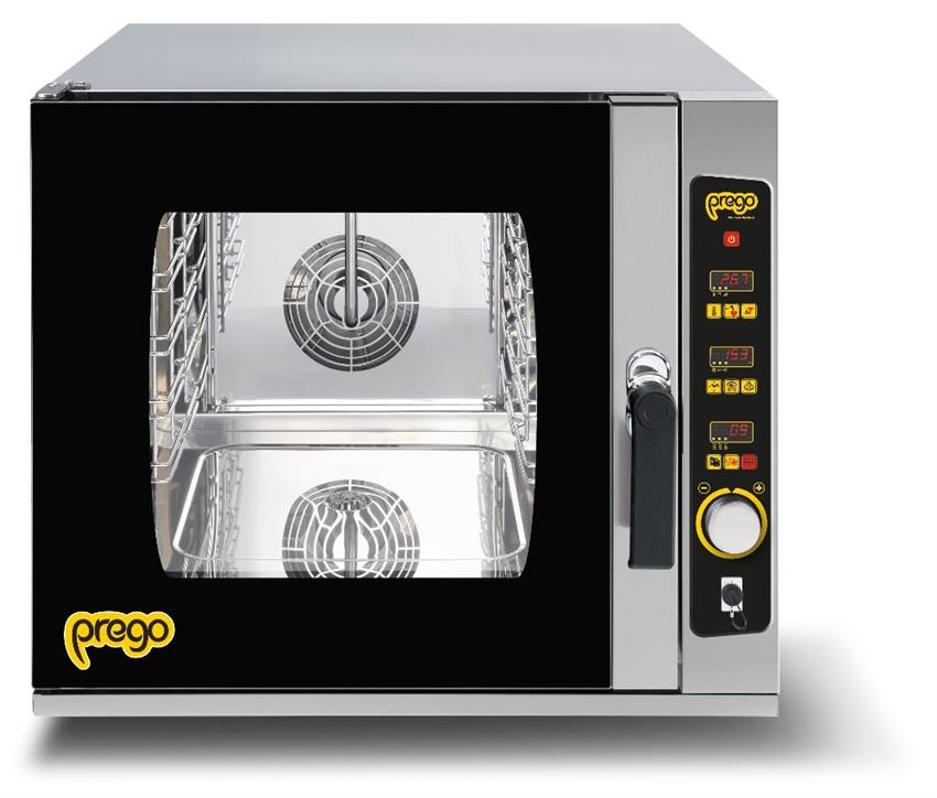 Small industrial gray combi oven with digital display. Features horizontal air flow and stainless steel construction. Includes a 1-year warranty.