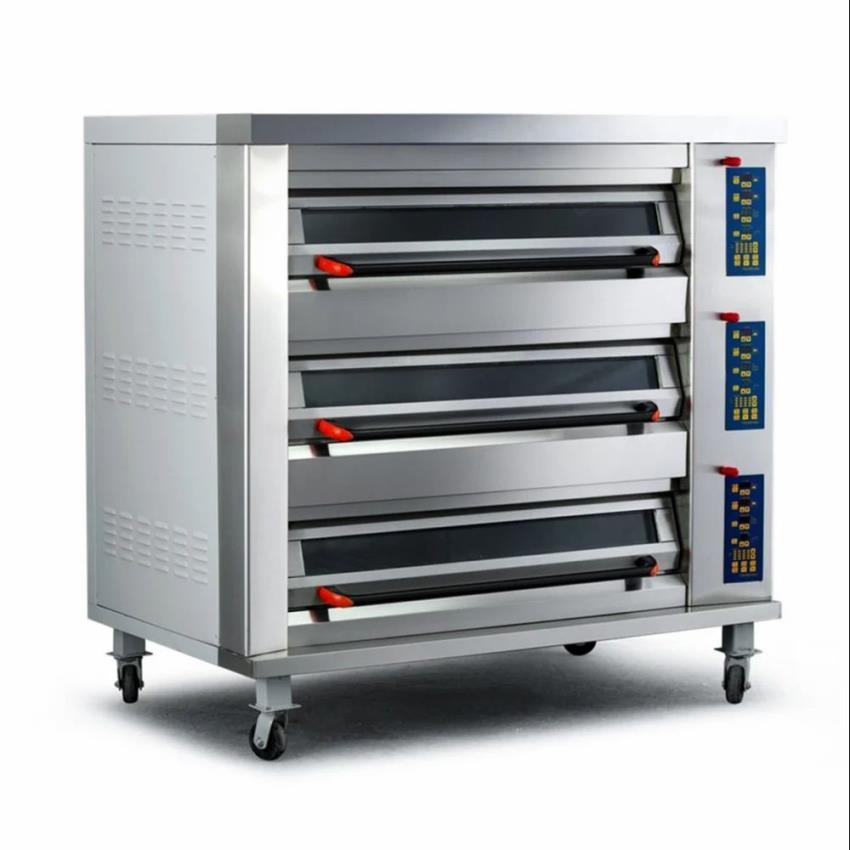Industrial electric bakery oven with 3kv capacity. Features a single stainless steel door and silver finish. Suitable for commercial baking applications. Medium size.