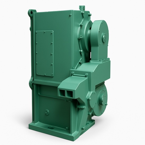New industrial flying shear machine in a green color, packaged in a cardboard box. Ideal for high-volume cutting applications.