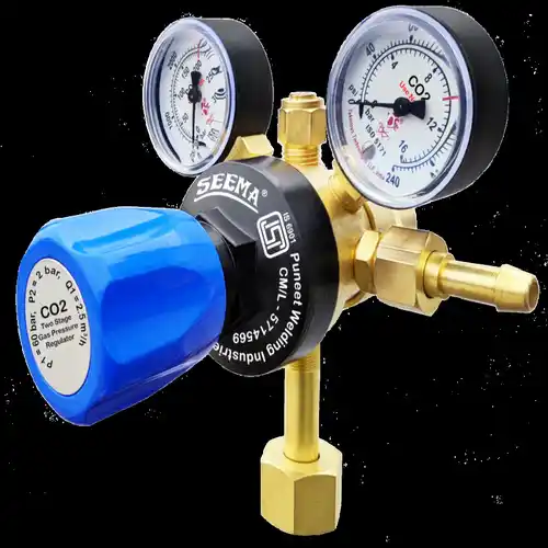 Two-stage forged brass pressure regulator for industrial CO2 gas applications. Features robust construction for reliable performance. Minimum order quantity: 12.
