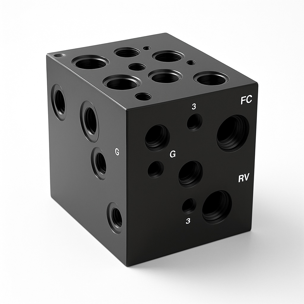 Square, black hydraulic manifold block designed for industrial applications. Offers excellent rust resistance. New condition, made in India.