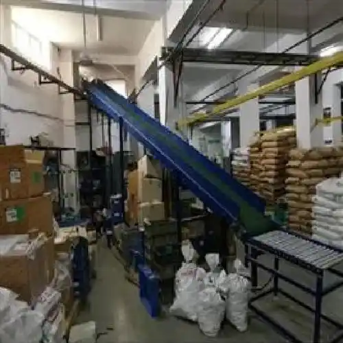 New electric industrial inclined belt conveyor for pharma applications. Features a PU plan rubber belt, 40 ft length, 15 ft height, and 1 Ton material handling capacity at 220 V.