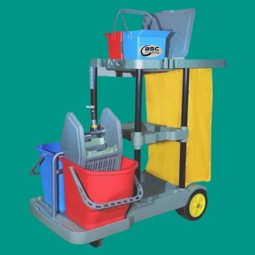 Multicolor plastic industrial janitorial trolley. Offers 100 kg load capacity with four buckets for versatile cleaning and maintenance in industrial settings.