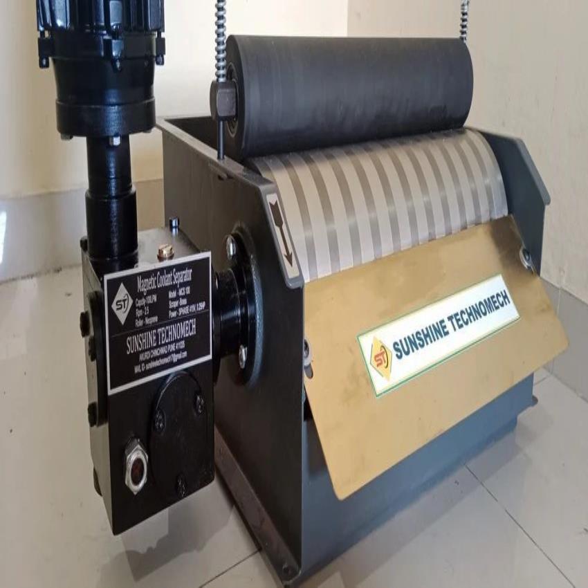 Magnetic coolant separator for ceramic, food, oil, pharma, chemical, and sewage industries. 150mm drum diameter, 360mm length, 2.5 RPM, 1800 Gauss using Neodymium magnets.