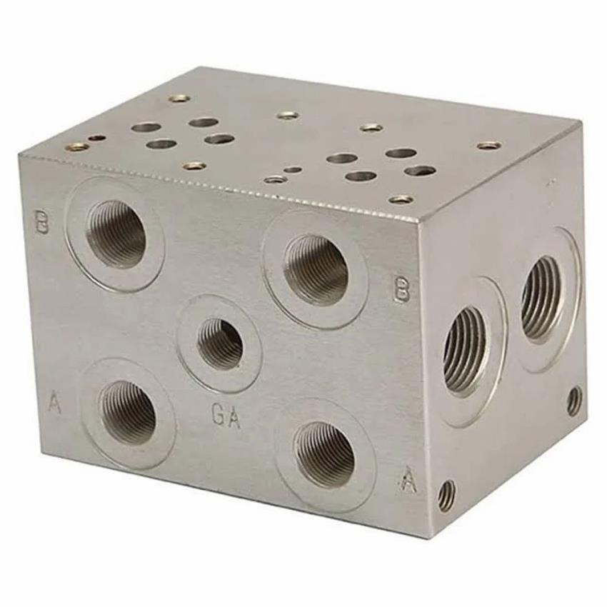 Rectangular mild steel hydraulic manifold with matt finish for industrial applications. Manufactured in India to ASTM standards. Driven by hydraulic power.