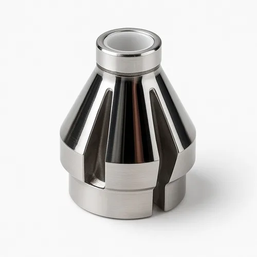 Round, silver, industrial wire guide made of polished stainless steel. Packaged in a box for industrial applications. Durable and corrosion-resistant for manufacturing environments.