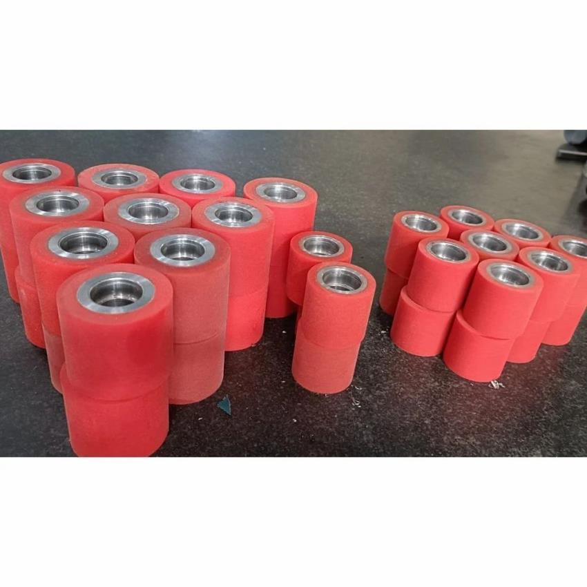 Red, glossy PU track roller (ORI-PR) with 85 Shore D hardness. 15mm bore size. Ideal for industrial use, made in India.