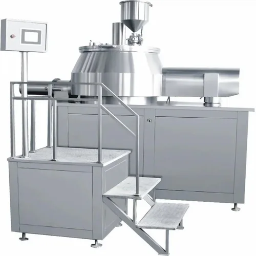 SS316 industrial rapid mixer granulator. Electric powered, 210V, 50Hz. Silver color. Capacity of 120 L/hr. Made in India.