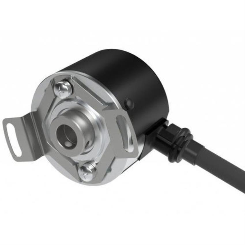 Industrial round shaft rotary encoder (TRD SHR20C0) with 360 PPR and quadrature signal. Operates on 5-24 VDC, features a 6mm shaft diameter and 1m cable. Ideal for automation.