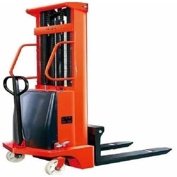 This steel semi-electric stacker offers a 1.5-2 Ton lifting capacity with battery power. It reaches a lifting height of 5.4 meters, suitable for industrial use as a fork stacker machine.