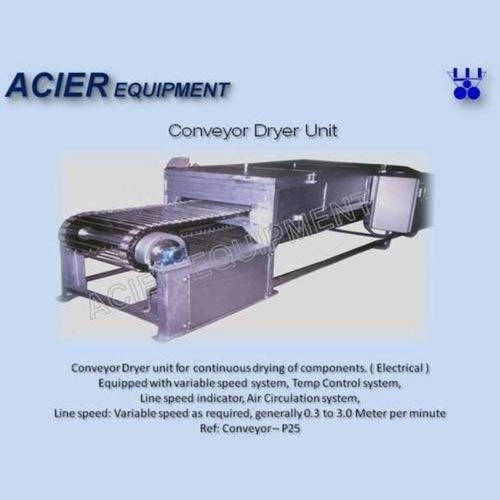 Stainless steel roller conveyor dryer for industrial use. Electric powered, new condition. Features a robust roller conveyor structure for efficient material handling and drying.