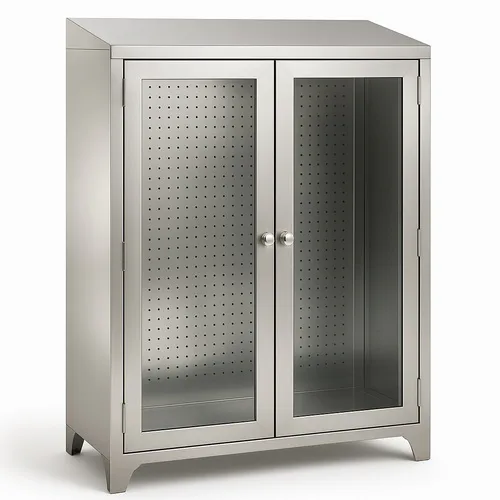 Industrial stainless steel cupboards with double sliding doors. Constructed from SS 304 metal for durability in footwear and pharmaceutical applications. Features cold-rolled steel wood style.