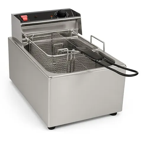 Industrial deep fryer, 5 Liter oil capacity. Constructed from durable stainless steel. Operates on electric power with 50 Hz frequency. Dimensions: 29 x 16 x 12 inches.