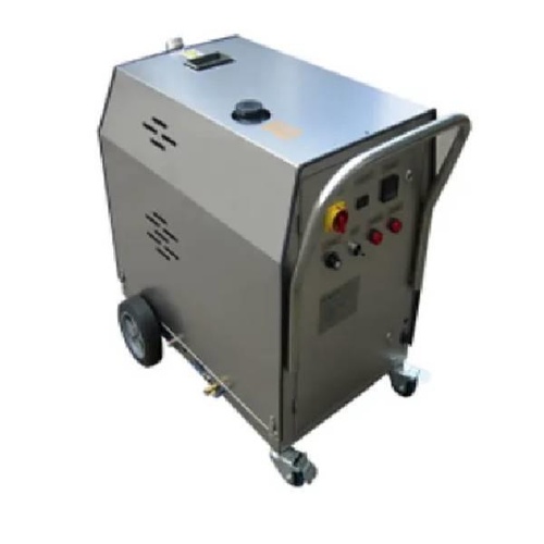 Three-phase electric steam car washer with 500 Watts power and 10 Bar pressure. Reaches 150°C max temperature, pre-heats in 4 minutes, and offers a 1200 cc/min flow rate.