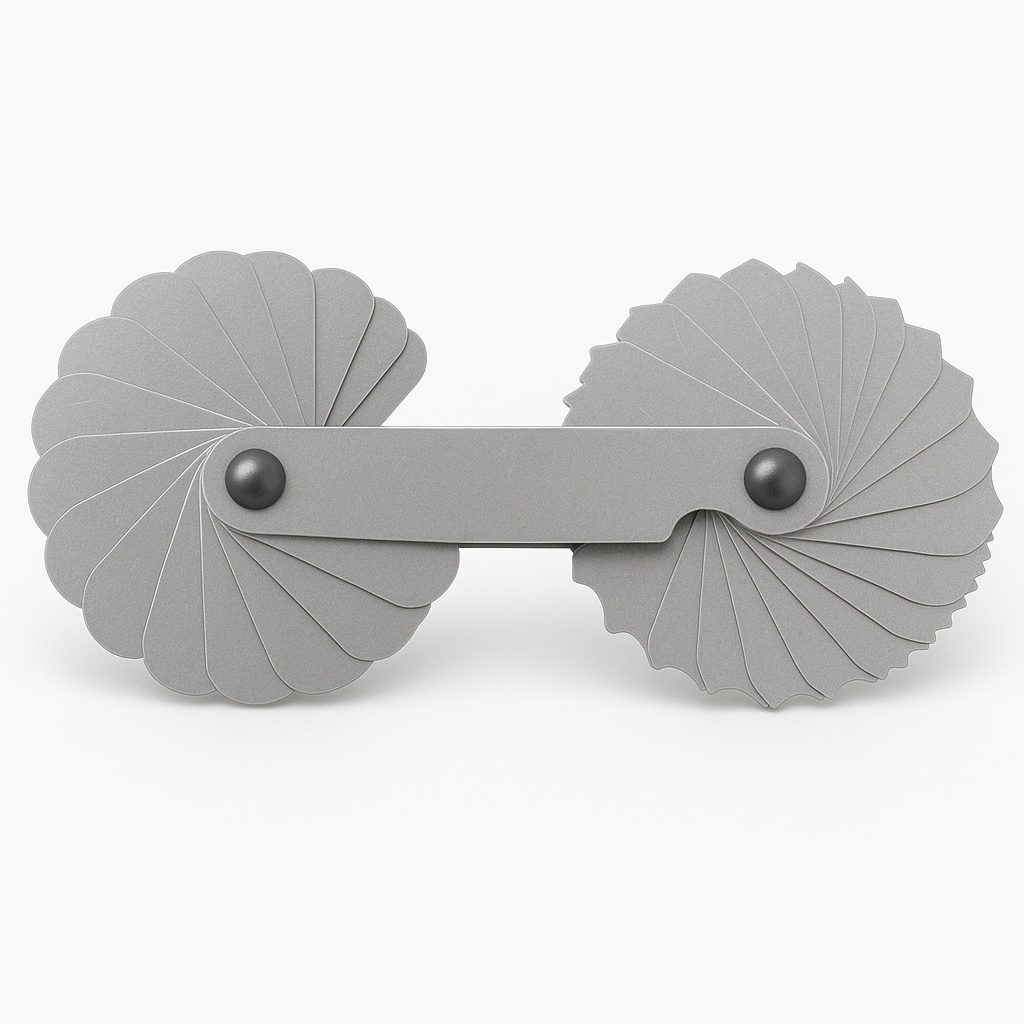 High-grade steel radius gauge, 34 leaves. Covers sizes from 1 to 7 inches. Suitable for industrial applications requiring precise radius measurement.