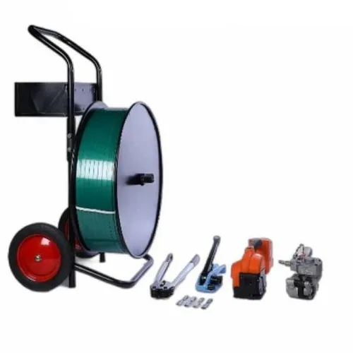 Heavy steel strapping trolley for industrial applications. Features two wheels for mobility. Made in India, available in ready stock. Ideal for efficient strapping operations.