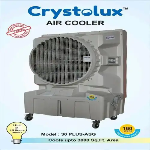 Industrial Tent Cooler made of plastic. Features 150 L tank capacity, 3 speeds, 30-inch blades, and 75 ft air flow. Low noise level.