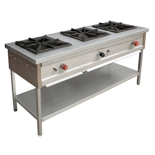 Industrial three burner range machine measuring 66"x24"x34"+6". Designed for commercial food preparation. Durable construction for demanding kitchen environments.