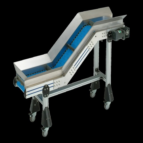 Automatic Mild Steel Z Type Belt Conveyor for industries. Features three-phase power, inclined design, 20 feet length, and 120 m/min speed.