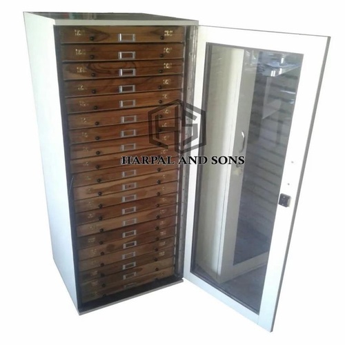 Teak wood insect showcase cabinet with 20 drawers and a locking system. Features a glass top and plyboard construction. Best quality, made in India.
