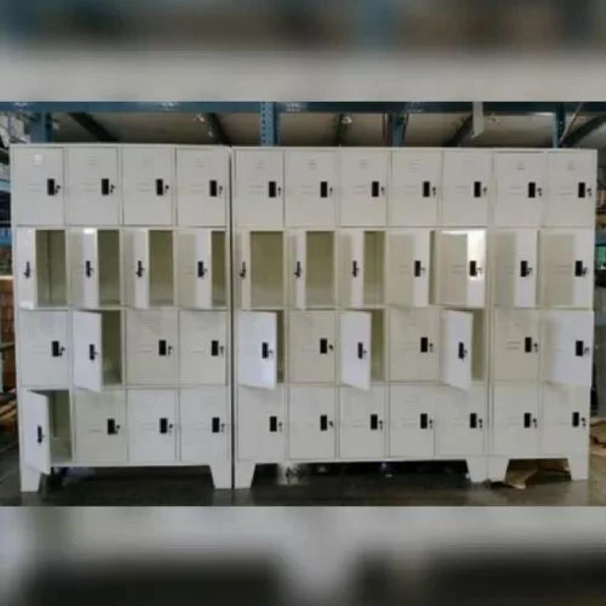 School storage locker with 20 compartments made of corrosion-resistant, paint-coated mild steel. Shelf size 92 cm x 45 cm x 200 cm, 1000 kg capacity.