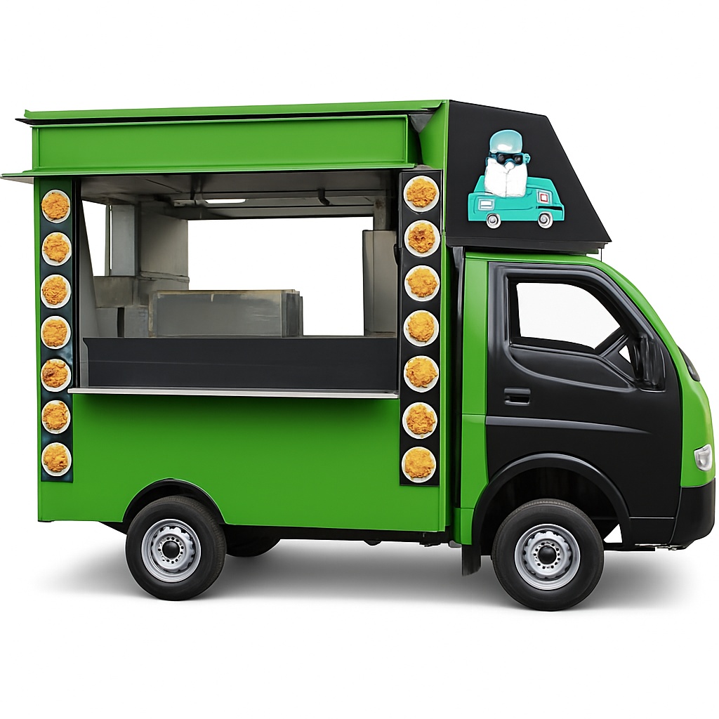 Electric-powered food cart body maker service. Features a double-seater, non-AC design for mobile food operations. Ideal for custom food cart builds.