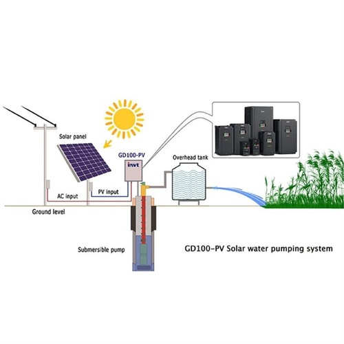 INVT solar pump controller rated from 0.4kW to 110KW. Operates on single or three phase 220V, with a maximum fluid temperature of 45°C.