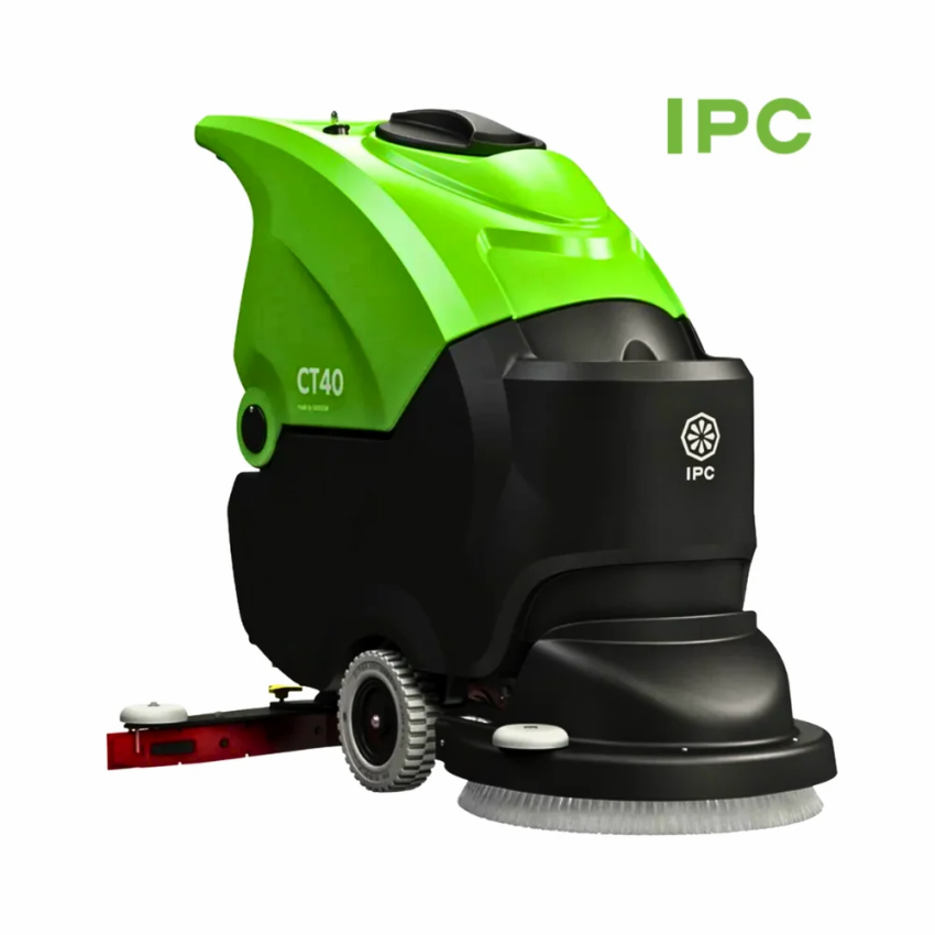 Battery-operated walk-behind scrubber drier with 50L solution tank, 50L recovery tank, 750W rated power, and 900 m2/hr productivity.
