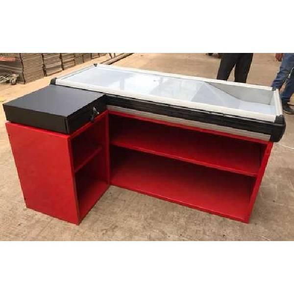 Durable iron cash counter machine for supermarkets. Features a robust design with a weight tolerance capacity of 200kg. Dimensions: 900 L x 700 W x 2100 H mm, color coated finish.