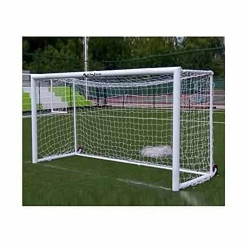 Durable iron football goal posts in white. Hand-stitched construction ensures quality. Ideal for football fields. New condition, minimum order of 5 pairs. Made in India.