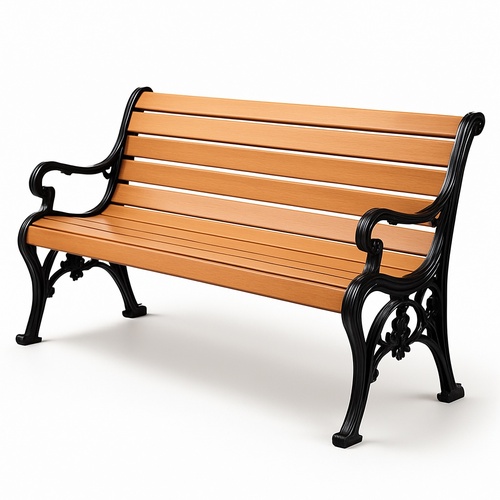 Modern brown iron garden bench, pre-assembled, with armrests and backrest. 3 seater capacity, 90 Kg weight, 250 KG load capacity. Size: 15000mm x 450mm x 750mm.