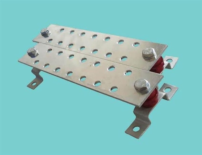 Galvanized iron rectangular busbar for earthing applications. Dimensions are 110 x 35 x 6 mm. Grey in color, robust construction.