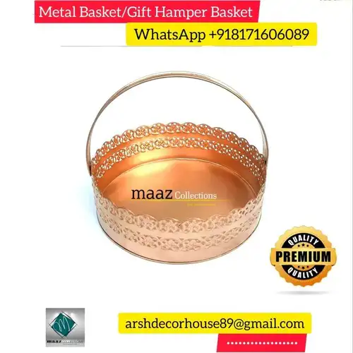 High-quality iron metal gift hamper basket, powder coated finish. Customized size, shape, and color options available. Weighs 0.200 grm.