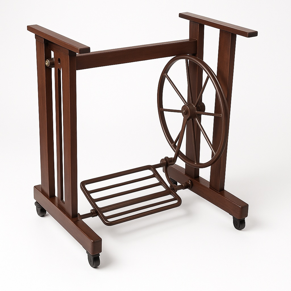 Corrosion-resistant iron sewing machine stand. Features paint-coated finish and brown color. Length 3-4 feet with wheel diameters of 10-17 inches. Provides stable support.
