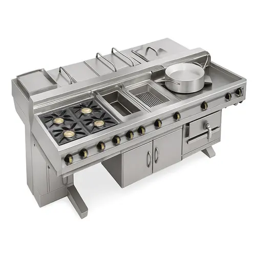Commercial cooking suite designed for island kitchen layouts. Provides a versatile platform for a wide range of culinary preparations.