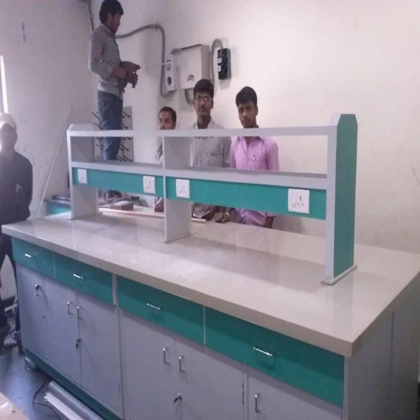 Custom-built island table with reagent rack for R&D labs. PP material construction, lockable drawers, and available sink. Delivery in 6-8 weeks.