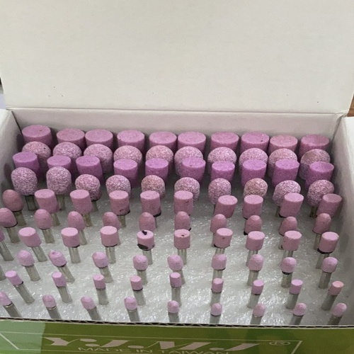 Pink aluminum oxide grinding wheel, 3mm diameter, designed for polishing applications. Packaged in a box. Minimum order quantity is 1100 pieces.