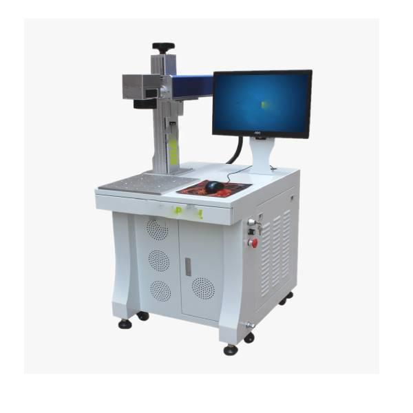 Semi-automatic fiber laser machine for hallmarking or logo marking on silver/gold. Features 800VA power, 10000 characters/min speed, and 100,000 Hrs. laser source life.