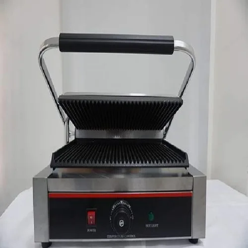 Manual, jumbo-sized single sandwich griller in silver. Constructed from SS (stainless steel). Designed for commercial usage. Features a manual operation for ease of use.