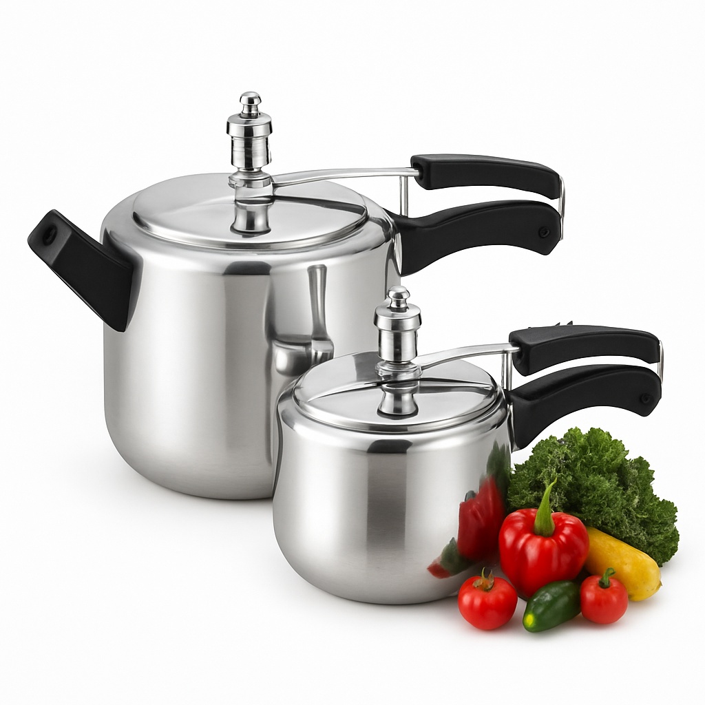 Indian-made silver aluminium pressure cooker. Designed for efficient and safe cooking in home kitchens. Durable material ensures longevity and reliable performance.