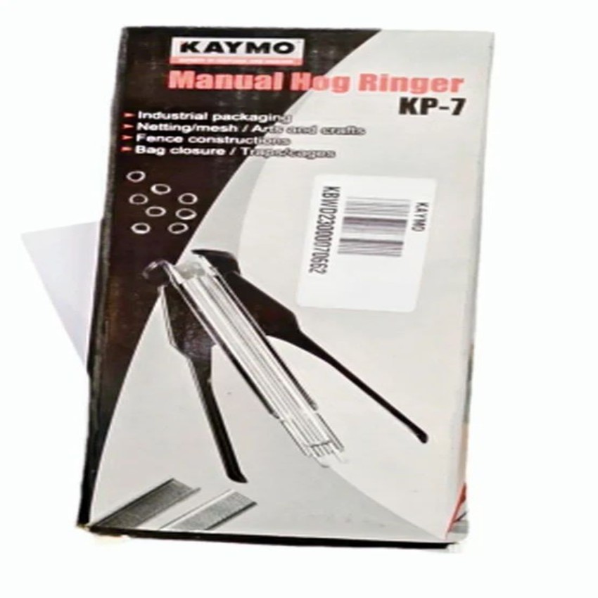 Manual hog ringer, 7-inch size, 18 gauge. Operates at 50 psi, staples 100 pins per load. Features C-ring type, 6-month warranty.